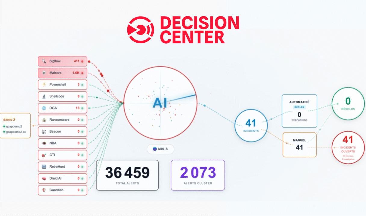 Gatewatcher DECISION serves as the intelligence and control core for threat response. It leverages the triage and qualifications provided by the DETECTION CENTER, incorporates false-positive handling, and capitalizes on global contextualization through the Data Lake, Cyber Threat Intelligence (CTI), and the Knowledge Base.