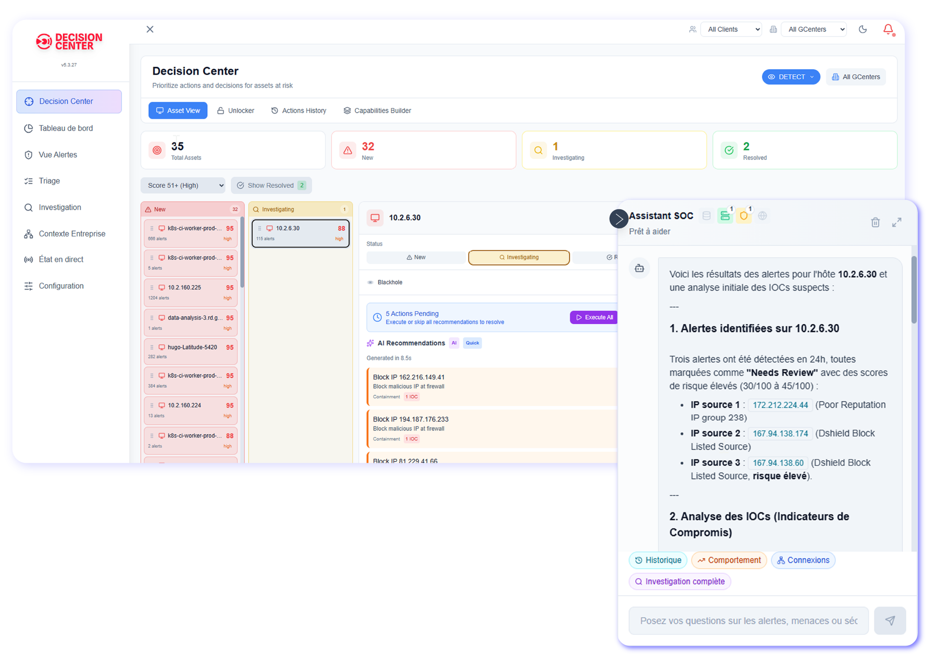 The DECISION CENTER acts as an intelligence hub, leveraging advanced agentic AI capabilities to consolidate, enrich, and structure security signals. It transforms detection outcomes into clear, prioritized, and explainable action plans, supporting governance aligned with business objectives.