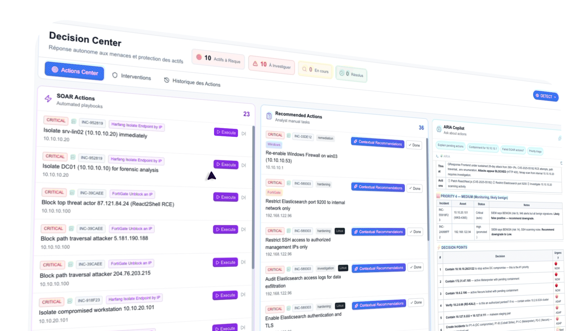 En consolidant les données de l’ensemble de votre écosystème, le Decision Center normalise, déduplique, corrèle et enrichit les événements en temps réel. Il applique ensuite un raisonnement agentique pour qualifier chaque contexte de compromission possible à partir des preuves techniques, de la threat intelligence et de la réalité métier. Le Decision Center produit : un verdict justifiable, un score explicable et un plan d’action priorisé, prêt à être exécuté.